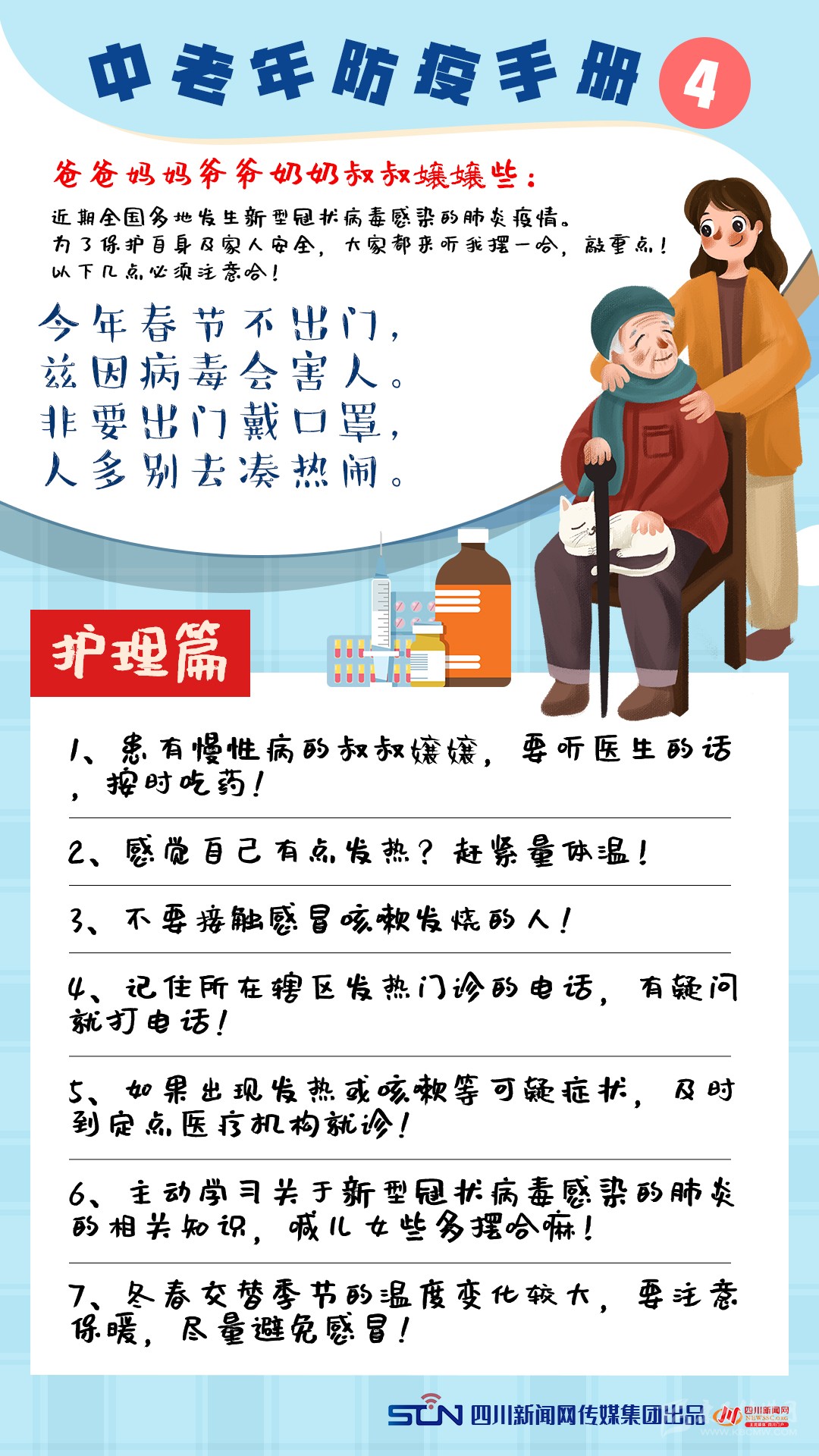 對(duì)此,為了讓“這屆難帶的父母”進(jìn)一步認(rèn)識(shí)新型冠狀病毒感染的肺炎疫情,四川新聞網(wǎng)特別推出《中老年防疫手冊(cè)》,呼吁老年人重視疫情,科學(xué)防控,做好自己健康的第一責(zé)任人。還在等什么,快轉(zhuǎn)給你那“倔強(qiáng)”的父母吧!