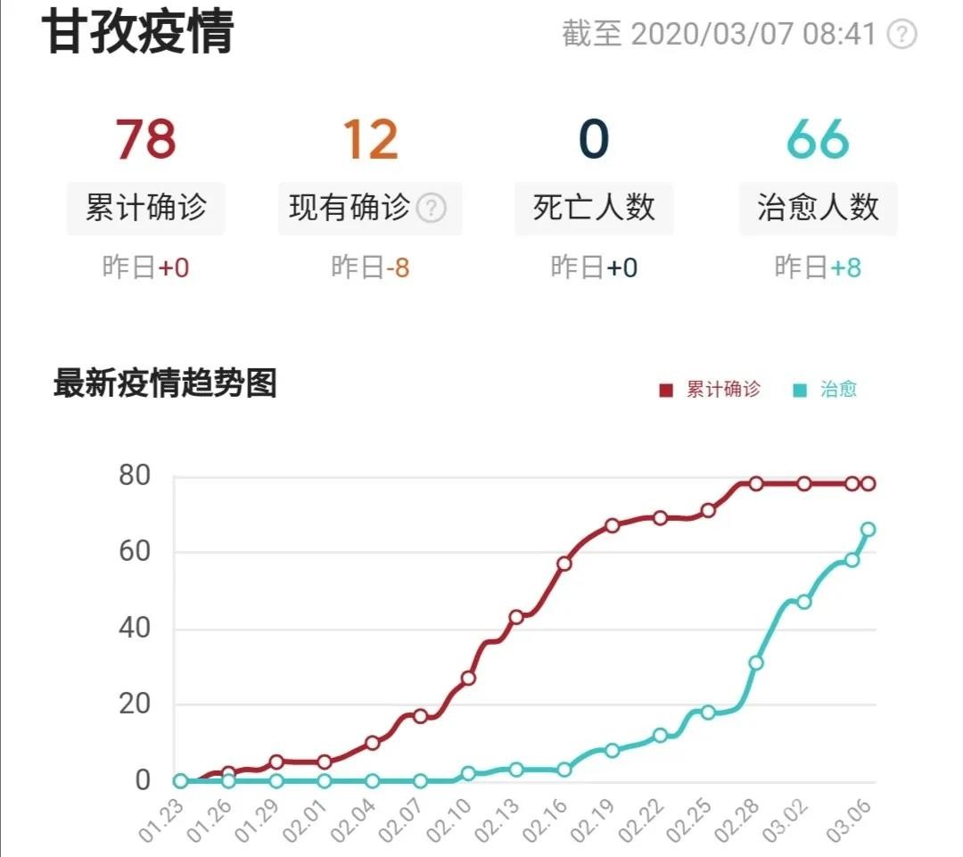 截至3月6日24時(shí),我州累計(jì)報(bào)告確診病例78例,累計(jì)治愈出院66人(道孚縣61人、康定市2人、色達(dá)縣2人、稻城縣1人),其余12人均在定點(diǎn)醫(yī)院隔離治療,25名密切接觸者正在接受醫(yī)學(xué)觀察。我州道孚縣連續(xù)8天無確診病例報(bào)告,其余17個(gè)縣(市)連續(xù)32天無確診病例報(bào)告。
