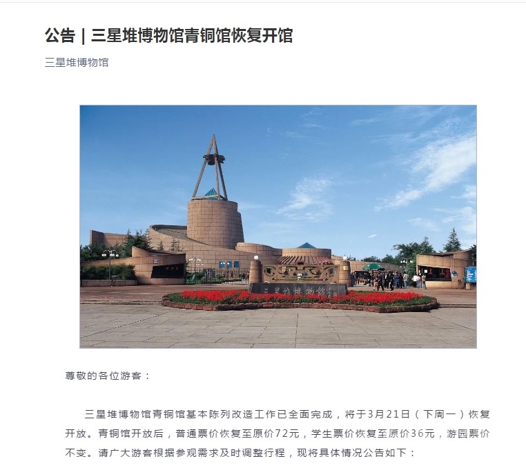 公告 | 三星堆博物館青銅館恢復(fù)開館