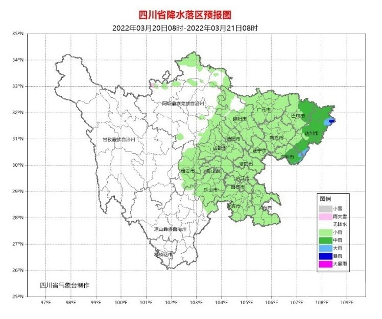21日白天到晚上,盆地各市陰天間多云,廣元、綿陽、德陽、巴中、達(dá)州、南充、廣安、瀘州、雅安9市和成都西部、樂山南部有小雨,其中達(dá)州局部有中雨;阿壩州和甘孜州北部、涼山州東北部多云間陰有陣雨(雪),局地中雨(雪),甘孜州南部和攀西其余地方多云見晴。