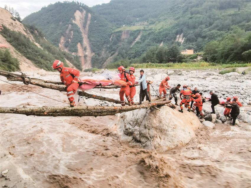 道路中斷、信號中斷,河流上漲、橋梁垮塌?!皼]有橋,我們的雙手就是橋。”關(guān)鍵時刻,四川省森林消防總隊甘孜支隊消防員兵分兩路實施營救。一路“繩為引、步為尺”先期過河救治傷員,一路就地取材急流上用樹干搭起“生命通道”,自制擔(dān)架將傷員一一運送過河;截至5日晚23時40分,甘孜森林消防隊員們翻山越嶺往返近7小時,安全轉(zhuǎn)運重傷員24人、近200名群眾,徒步行程18公里。