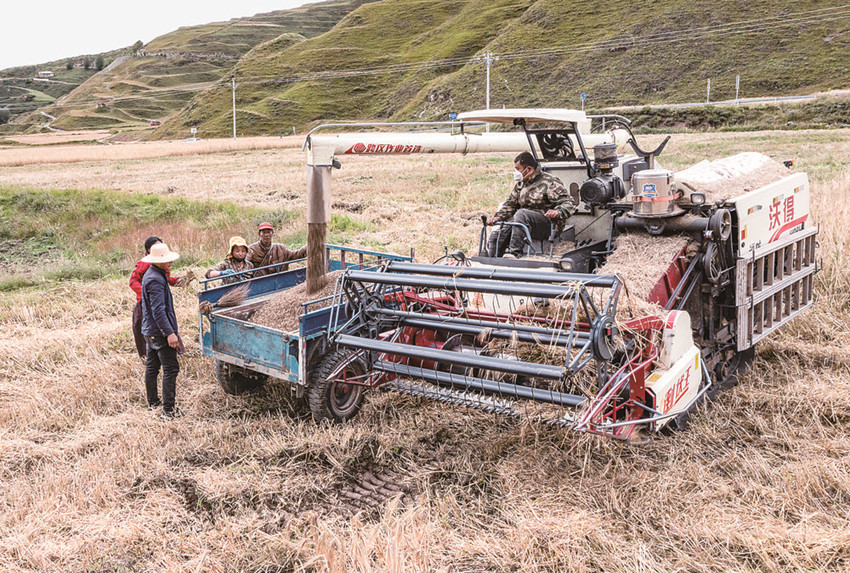 收割機正在收割青稞。 本網(wǎng)資料庫圖