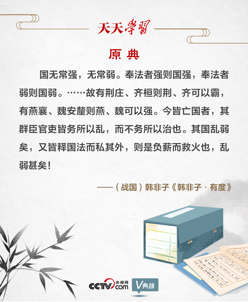韓非子是戰(zhàn)國時(shí)期法家思想的集大成者?!坝卸取?,就是有法度。韓非子把“奉法”作為治亂興亡的關(guān)鍵,提出“國無常強(qiáng),無常弱。奉法者強(qiáng)則國強(qiáng),奉法者弱則國弱”。意思是,國家不會(huì)永遠(yuǎn)富強(qiáng),亦不會(huì)長(zhǎng)久貧弱。執(zhí)行法度的人堅(jiān)決,國家就會(huì)富強(qiáng);執(zhí)行法度的人軟弱,國家就會(huì)貧弱。