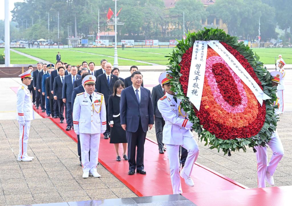 13日上午,習(xí)近平總書(shū)記在河內(nèi)瞻仰胡志明陵并敬獻(xiàn)花圈。