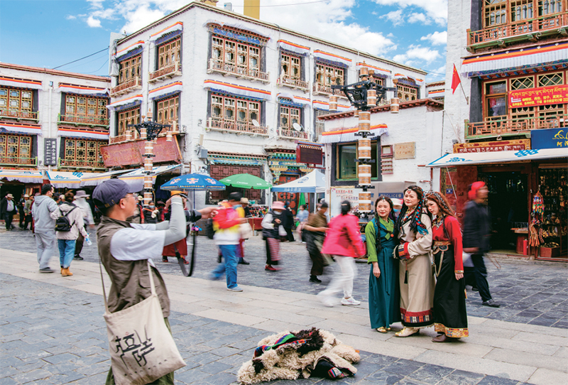 千年八廓街,見證民族團(tuán)結(jié)。2021年7月,習(xí)近平總書記來到位于西藏拉薩老城區(qū)的八廓街,感慨地說:“千年八廓街,是我們各民族建起來的八廓街。各民族文化在這里交流交往交融,我們中華民族的大家庭在這里其樂融融?!眻D為2023年6月13日,游客身著藏裝在八廓街拍照留念。 新華社記者 姜帆/攝