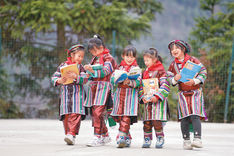 位于貴州省黔東南苗族侗族自治州從江縣大山深處的西山鎮(zhèn)中寨教學(xué)點(diǎn),是一所全校均為瑤族學(xué)生的“微小學(xué)”。近年來,隨著教學(xué)條件逐漸改善,學(xué)校發(fā)生了翻天覆地的變化。圖為2023年2月16日,領(lǐng)到新書的瑤族學(xué)生在一起交流。 新華社記者 楊文斌/攝