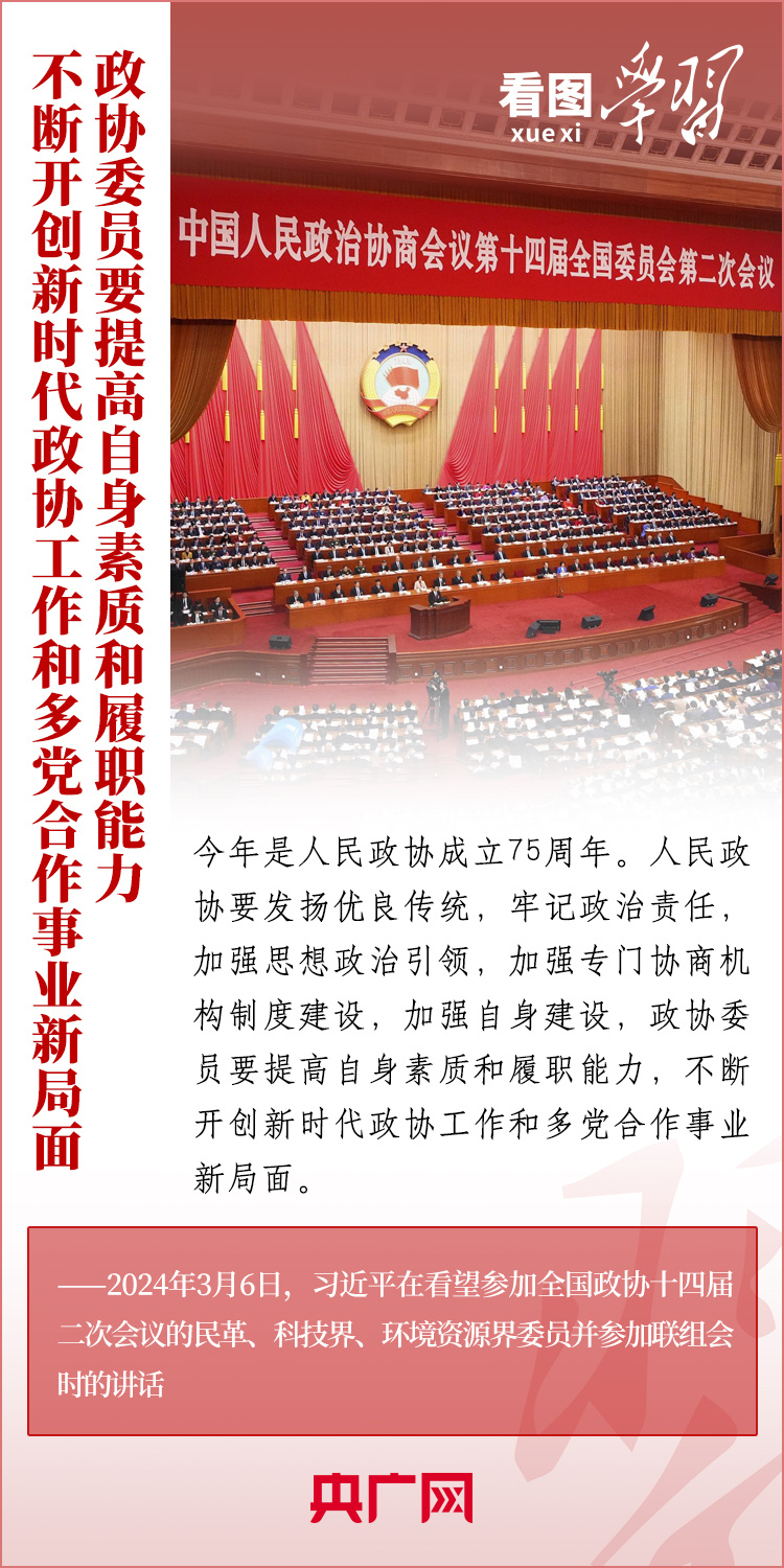 今年是人民政協(xié)成立75周年。3月6日下午,習近平總書記在看望參加全國政協(xié)十四屆二次會議的民革、科技界、環(huán)境資源界委員并參加聯(lián)組會時強調(diào),人民政協(xié)各黨派、各團體、各族各界各方面人士要圍繞中共二十大提出的重大戰(zhàn)略任務(wù)和中央經(jīng)濟工作會議部署,深入調(diào)查研究,積極建言資政,廣泛凝聚共識,助力中國式現(xiàn)代化建設(shè)。一起來學習!