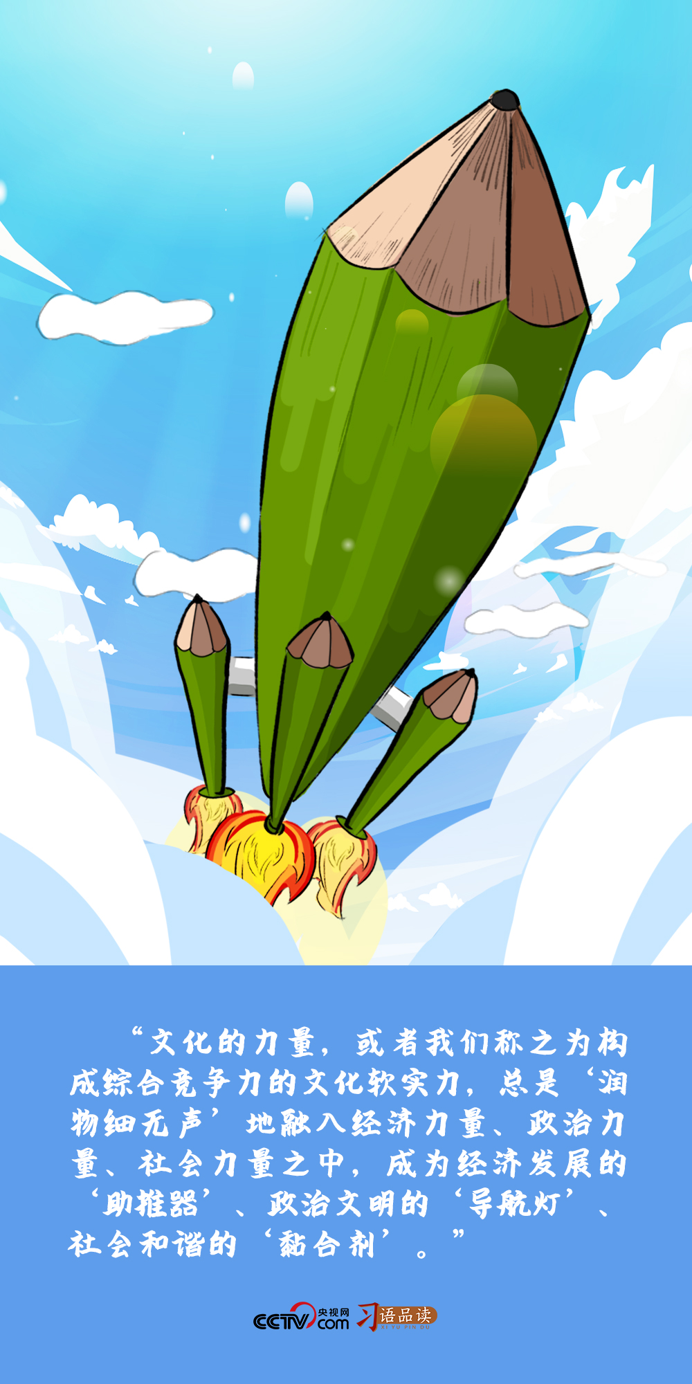 習(xí)近平用“助推器”“導(dǎo)航燈”“黏合劑”來打比方,闡述文化力量與經(jīng)濟(jì)力量、政治力量、社會(huì)力量交融互動(dòng)、融合發(fā)展的關(guān)系,形象地解析其在經(jīng)濟(jì)發(fā)展、政治文明、社會(huì)和諧等方面所起到的重要作用。