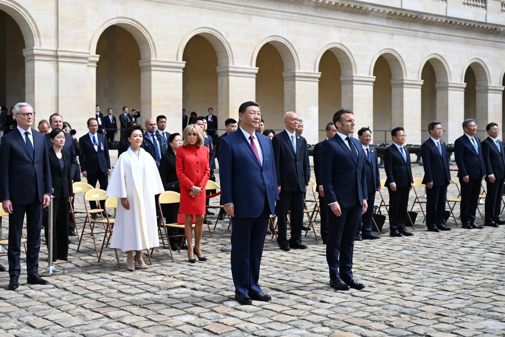 ??當(dāng)天下午,習(xí)近平在巴黎出席馬克龍舉行的隆重盛大歡迎儀式。兩國元首檢閱法蘭西共和國衛(wèi)隊和陸海空三軍儀仗隊,并觀看分列式。
