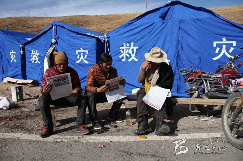 康定地震發(fā)生以來,前往災(zāi)區(qū)采訪的記者堅持向災(zāi)區(qū)群眾帶去《甘孜日報》藏漢文報,讓群眾在安置點就能了解黨委、政府組織抗震救災(zāi)的情況。圖為江巴村民正在救災(zāi)帳篷外看報。 李慶林 攝影報道