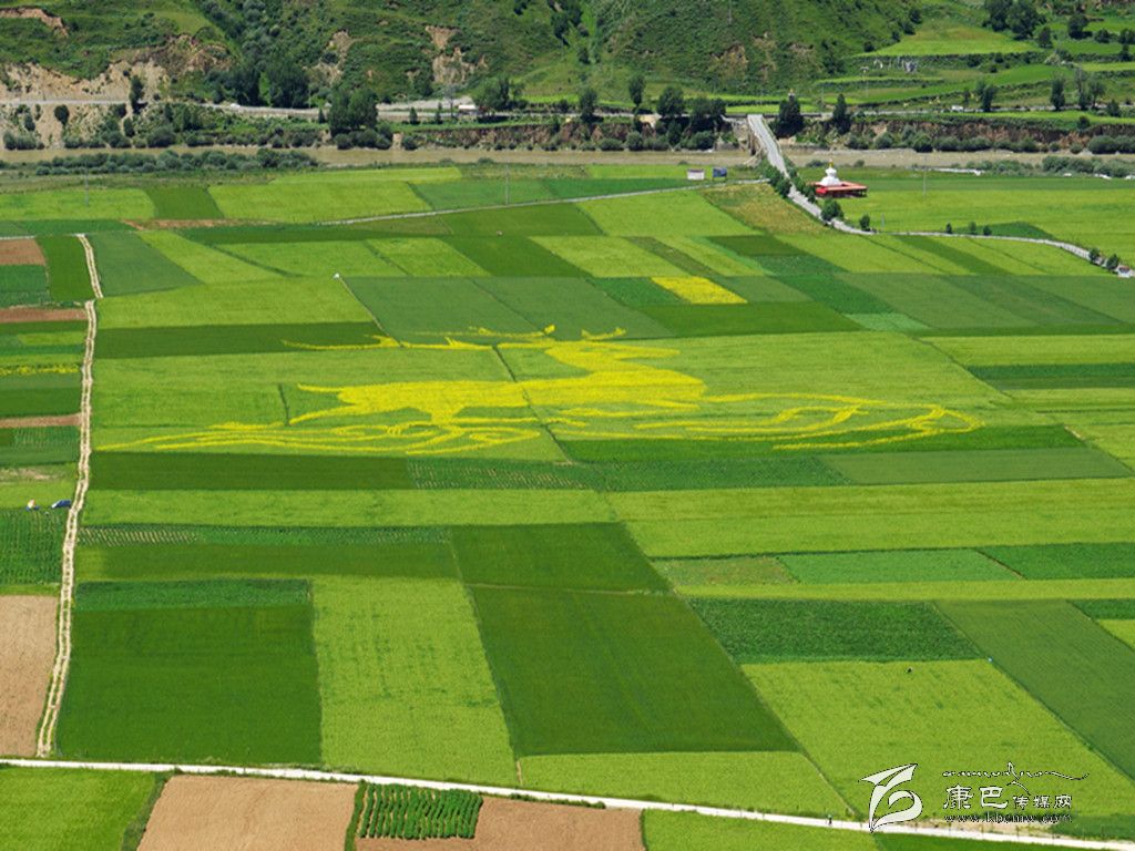 本網(wǎng)訊(記者 張兵 貢呷沙鄧 文/圖) 近日,記者在爐霍縣宜木鄉(xiāng)蝦拉沱村后山觀景平臺上看到一幅神奇的畫,在平坦的田野中清晰呈現(xiàn)出的一幅金鹿圖案,構成圖案的材料是自然生長的油菜,襯托畫面的是正在不斷成熟的青稞。據(jù)縣農牧和科技局領導介紹,這是該縣今年實施創(chuàng)意觀光農業(yè)、全力發(fā)展休閑觀光農業(yè)的成果。