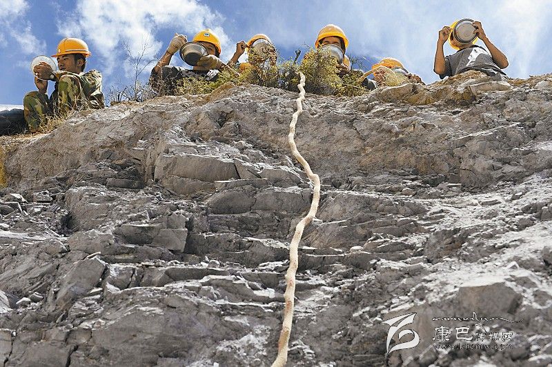 工人在真康壩取水點(diǎn)半山腰吃午餐。