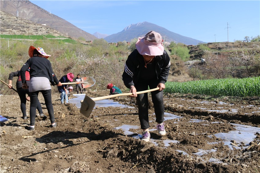 4月15日,記者從巴塘縣城出發(fā),沿國道318線走訪了該縣的5個村莊,沿途看到絕大多數(shù)耕地都鋪上了地膜,記者在該縣黨巴鄉(xiāng)玉卡通村看到正在忙碌播種玉米的村民。而這支春耕隊(duì)伍的“帶頭人”正是該村村民大尼瑪,在場的人都是其家人或鄰居。