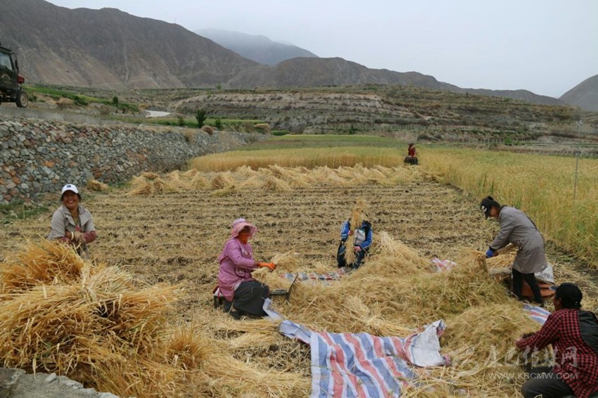 本網訊(劉小兵 金鑫 攝影報道)眼下,我州多地群眾正在忙碌春耕,海拔較低、氣溫較高的得榮縣曲雅貢鄉(xiāng)卻已是一片麥浪金黃,忙碌著收割冬小麥的人們三五成群地撒落在田間地頭。一張張溢滿笑容的臉和一束束飽滿的麥穗構成了一幅幅豐收的喜悅圖景。