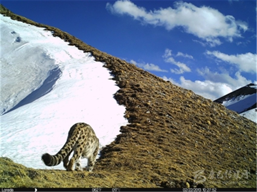 2016年4月16日19時27分,兩只小雪豹在新龍的一處山梁上走過。它們的母親在不久前經(jīng)過,也被相機(jī)拍下。