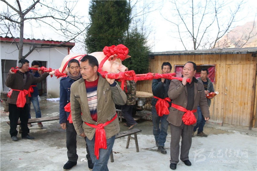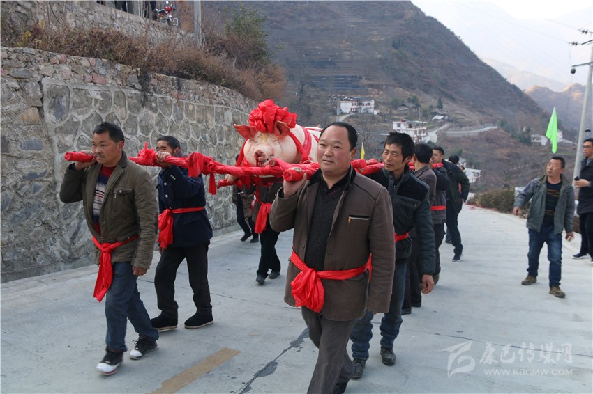 5個村民將年豬抬到秤上。360斤。村民為年豬準備大紅花。準備紙錢、香蠟。9點整,殺豬匠開始了他的工作,在眾人齊心協(xié)力下,光溜溜的年豬被打整干凈?!氨S游覀兇鍋砟觑L調雨順、五谷豐登,村民平安健康?!贝逯欣险呔催^天地后,8個身強力壯的村民站在年豬旁,豎著拇指齊聲說,今年家家戶戶還要養(yǎng)大肥豬。抬著年豬,村里的中老年人簇擁著,走在最前面,唱著悅耳的民謠,大意是歌唱幸福生活的,迎著2018年的第一縷陽光,村民們喜氣洋洋。到村里來的游客蜂擁拍照。