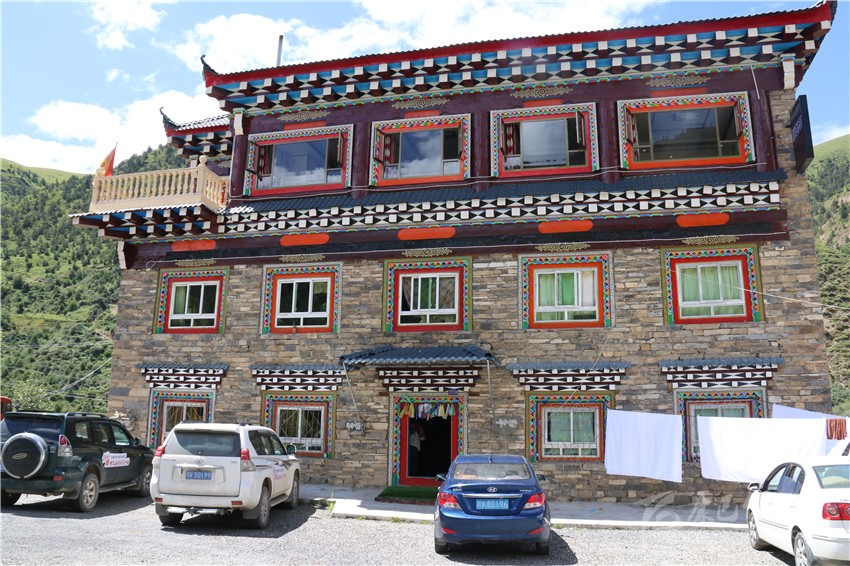 該酒店三樓一底,集餐飲、停車、住宿為一體,設(shè)單標(biāo)間和套房共計(jì)22間38個(gè)床位,雇傭了3名當(dāng)?shù)卮迕駧凸?,院?nèi)甚至配套了超市和茶樓;藏文化元素俯仰皆是,雕梁畫棟,規(guī)模配備,儼已成為全縣鄉(xiāng)鎮(zhèn)一道亮麗風(fēng)景。不論淡旺季,每間房價(jià)188元至258元不等。夏季正值入住高峰期,8月以來,幾乎天天客滿。