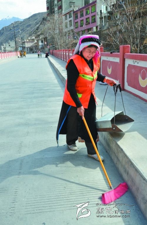 由于丹巴縣城素有風城之稱,五條山谷的風仿佛都聚集在了志瑪大姐負責的濱河路上,風的匯聚也成了垃圾的集中點,當時在分配工區(qū)時,許多清潔工都唯恐這段路落在自己頭上,可志瑪大姐卻主動承擔起這段路面的清潔任務,每天其他清潔工人還在睡夢中時,她就早早的起床,開始一天的工作。烈日當空時,別人都躲在家里乘涼時,志瑪大姐還在路段上來回的巡視,時刻保持路面的清潔。冬日來臨寒風呼嘯,城市里的人們都蜷縮在蝸居里開著空調、電暖氣等,享受著天倫之樂時,志瑪大姐卻穿著厚厚的冬裝,戴著手套在濱河路上費力的掃著地,她從來沒有叫過一聲苦,有人勸她放棄這段路,她總是笑著說:“國家給了我工資,我就要好好的干,再說城市如果沒有我們這些清潔工,那市民將會生活在臟亂差的環(huán)境里,將有損丹巴這座美麗小城鎮(zhèn)的形象。”