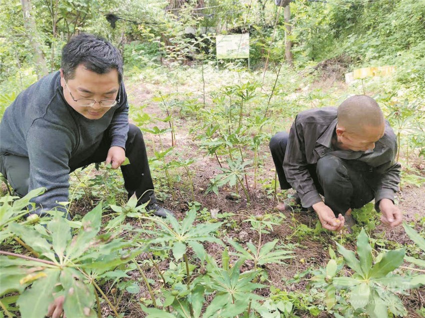 兄兄正在查看菌包。