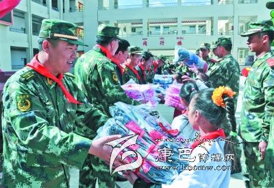 儀式上,8722部隊向?qū)W校贈送了價值萬余元的學習用品,拿著裝有鉛筆、水彩筆等各種文具的“愛心書包”,孩子們興奮不已。12歲的藏族女生登真啟珍告訴筆者:“今年的‘六一’兒童節(jié),武警部隊的叔叔們專門來看望我們,還送來了禮物,我感到特別開心。”儀式上,少先隊員們給參加慰問的部隊領導戴上鮮艷的紅領巾,孩子們還表演了精心排練的節(jié)目。一張張燦爛的笑臉,一陣陣蕩漾心扉的歌聲,傳遞著駐訓武警部隊與當?shù)厝罕姖鉂獾聂~水深情。