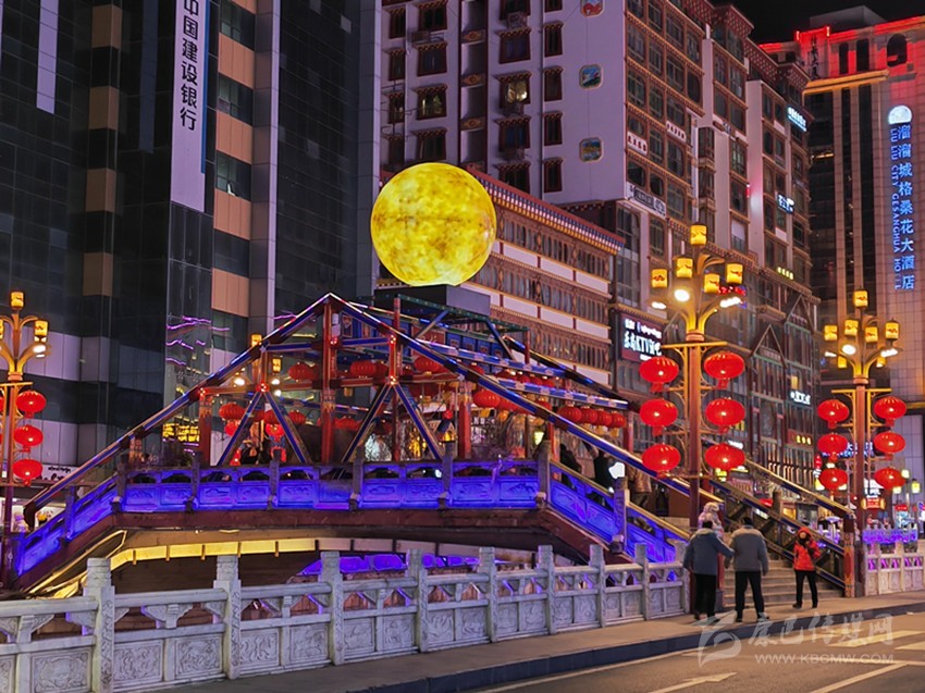 除了讓人眼前一亮的各種絢麗的花卉燈飾和被大紅燈籠、如意掛飾的大街小巷,最被市民津津樂(lè)道的莫過(guò)于中橋的明月景觀和東關(guān)U形廣場(chǎng)上的“五彩色神?!薄C髟戮坝^又稱《世界的康定》,此景觀以月球?yàn)橹黧w,在橋兩側(cè)再輔助以音符及五線譜造型。其寓意為情歌唱響世界,康定名揚(yáng)世界。而矗立在東關(guān)廣場(chǎng)上的新增雕塑景觀就更意義非凡了。雕塑通體是以一頭雄壯的牦牛形象呈現(xiàn),牦牛下方的紅色高臺(tái)正前方鐫刻的是政府公仆一心為民的錚錚誓言?!罢臓I(yíng)造喜慶洋洋的節(jié)日氛圍,讓我們感受到了濃濃的‘年味’,在黨和政府的關(guān)懷下,我們老百姓的生活一年更比一年好,幸福感也是一年更比一年強(qiáng)?!?5歲高齡的扎西激動(dòng)地跟記者分享著他的喜悅。