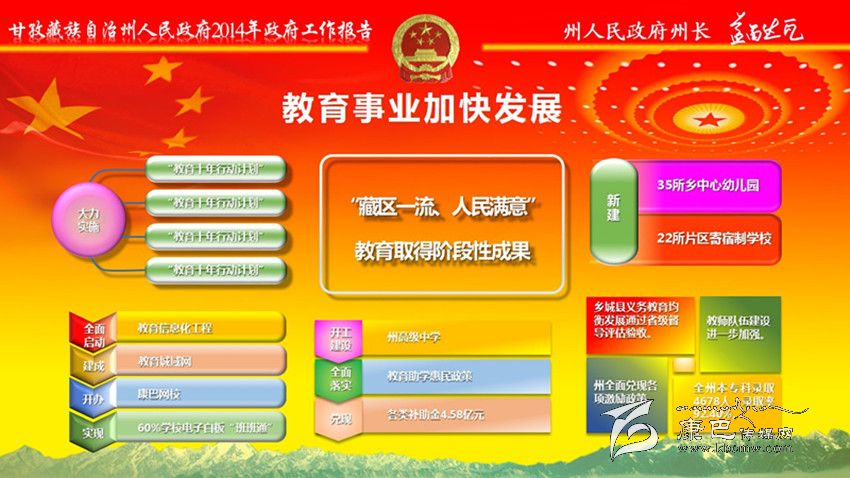 大力發(fā)展教育科技事業(yè)。緊扣“藏區(qū)一流、人民滿意”教育目標,堅持“規(guī)模適度、結(jié)構(gòu)優(yōu)化、拴心留人、提質(zhì)增效”原則,突出寄宿制教育、雙語教育、遠程教育及文化育人辦學特色,著力提高教育教學質(zhì)量。投資4億元,改造中小學(幼兒園)60所;整合資金1億元,推進數(shù)字甘孜教育工程;啟動免費義務教育向高中階段延伸,完成康定、瀘定、丹巴、九龍、爐霍五縣義務教育均衡發(fā)展省級督導評估。抓實百千萬康巴英才工程,定向培養(yǎng)緊缺專業(yè)人才600名。大力支持科技創(chuàng)新,建立健全產(chǎn)學研合作機制,繼續(xù)抓好與清華等國內(nèi)知名院校的合作交流。