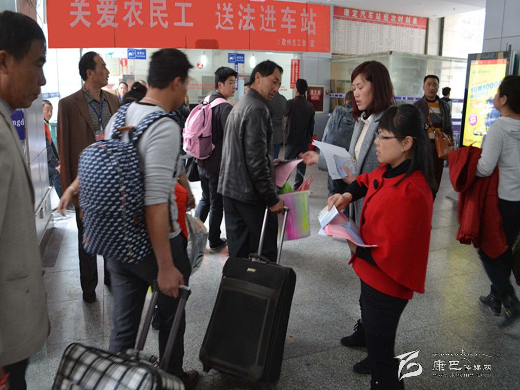 本網(wǎng)訊(宋華玉 記者 秦松 文/圖)“這個(gè)資料太實(shí)用了,讓我們可以了解自己的權(quán)益有哪些、勞動(dòng)合同書(shū)是怎樣的。”當(dāng)在康定汽車(chē)站內(nèi)的農(nóng)民工拿到由州總工會(huì)發(fā)放的法冶宣傳資料時(shí),他們?nèi)缫曊鋵毎愕卣J(rèn)真閱讀著宣傳資料,或小心翼翼地把資料裝進(jìn)行李中。4月5日至4月13日,州總工會(huì)在康定汽車(chē)站開(kāi)展了“關(guān)愛(ài)農(nóng)民工、送法進(jìn)車(chē)站”法治宣傳活動(dòng),正式啟動(dòng)了“學(xué)雷鋒、慶五一”服務(wù)職工(農(nóng)民工)系列活動(dòng),拉開(kāi)了州總工會(huì)2015年法制宣傳活動(dòng)的序幕。