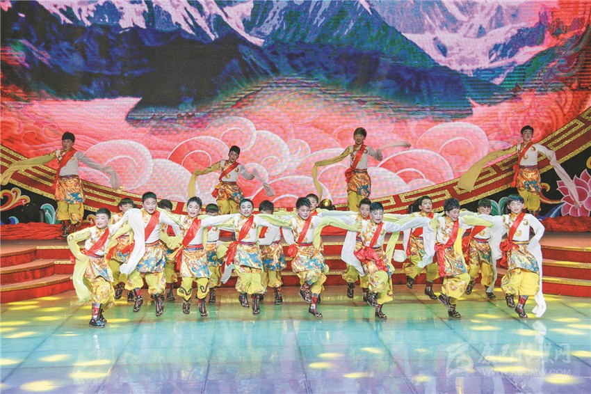 在團(tuán)拜會節(jié)目演出環(huán)節(jié),隨著主持人一句“柳綠枝頭待燕歸,金雞賀歲開門紅”脫口而出,20余名活潑、歡快的少年涌上舞臺,就著音樂的節(jié)拍,揮手踏足、左挪右轉(zhuǎn),翩翩起舞;少年們舞動的長袖映著縷縷斑斕的光束,依如雄鷹在拍打著飛翔的翅膀。這便是此次演出的開場節(jié)目《雛鷹飛翔》,一場絢麗多彩的“甘孜春晚”由此火熱開演。隨后,一群體態(tài)輕盈、妝如仙鶴的女子用靈動的舞姿為甘孜祈福,點明了此次團(tuán)拜會的一大主旨——祝福甘孜。