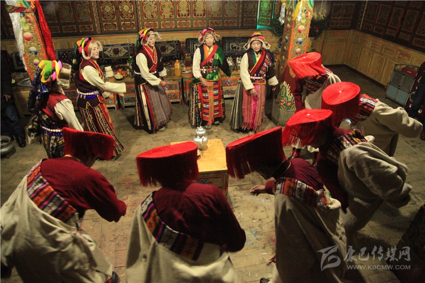 一家人穿上節(jié)日盛裝,按輩序就座。主婦手捧吉祥斗恭恭敬敬地走到長輩跟前說“扎西德勒”,對方抓幾粒麥子邊向上撒邊祝福說:“扎西德勒!美滿幸福,祝主婦身體健康,預(yù)祝明年大家仍如此團(tuán)聚歡慶。”再抓一點(diǎn)切瑪送進(jìn)嘴里。家庭儀式后,家中兩人一個拿青稞酒、銀酒碗,一個手捧切瑪,到左鄰右舍、親朋好友家拜年,敬獻(xiàn)切瑪、青稞酒,互相祝福。