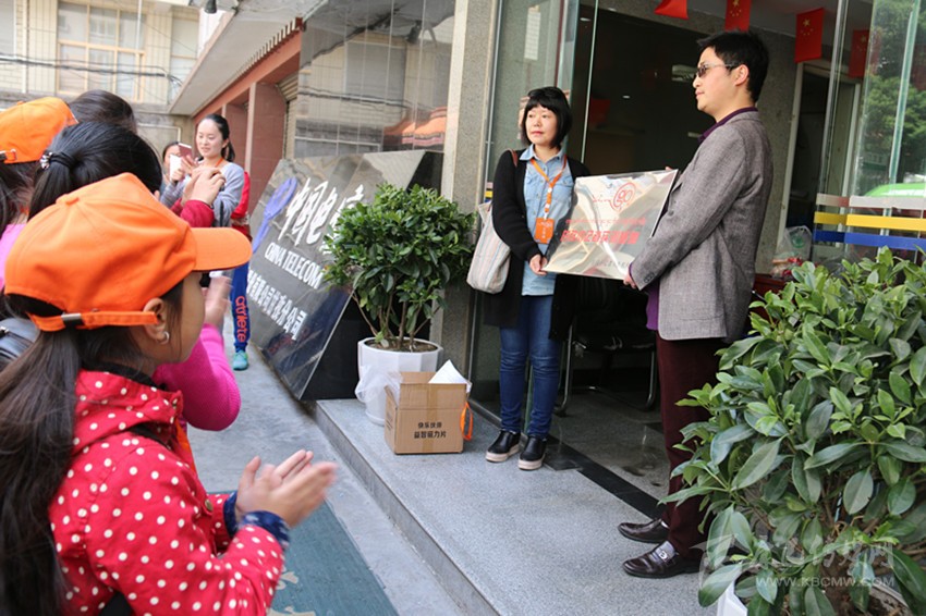 甘孜小記者活動負責人向電信甘孜分公司市場部總經理何宇檳頒發(fā)甘孜小記者實訓基地牌。