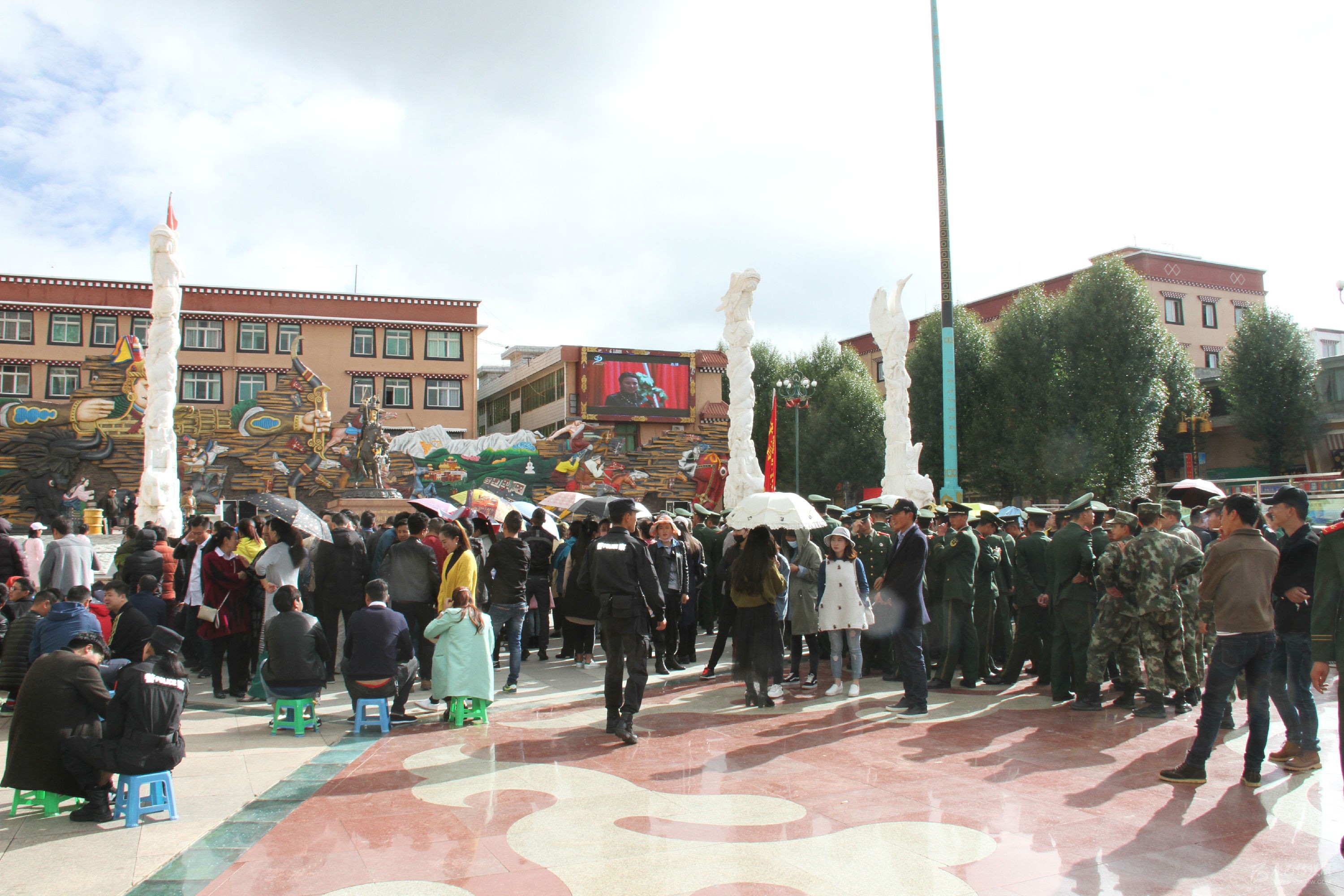 理塘縣格薩爾廣場(chǎng)上近千名干群收看大會(huì)盛況。