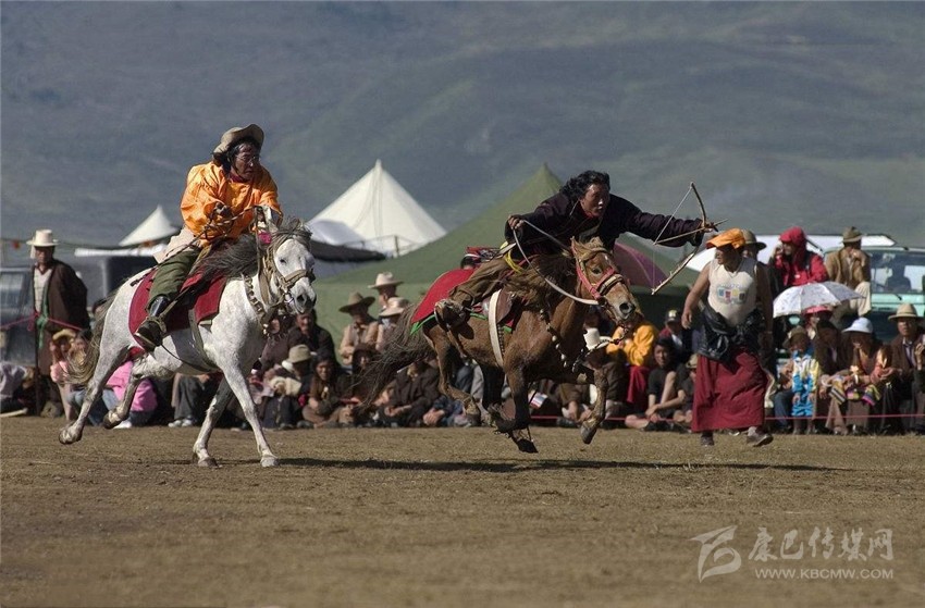 賽馬活動中的分耐力賽、小走賽、馬術(shù)表演等,馬術(shù)表演有馬背倒立、飛馬射擊、馬肚藏身、俯身拾哈達等項目。驚險刺激的賽馬,是充分展示藏區(qū)群眾健壯、靈巧和勇猛、膽大的一項活動,也是當(dāng)?shù)厍鄩涯瓯绕雌潴w魄、智慧和膽識的舞臺,對年輕小伙兒來說,這還是一個捕獲心儀的姑娘的芳心的絕好時機。所以,在康巴地區(qū)的賽馬活動始終都保持著精彩、激烈的特征。