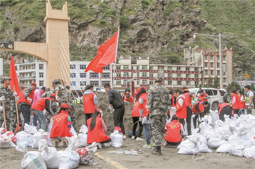 黨員志愿者活躍在抗洪搶險第一線。