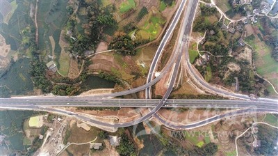 上午11時許,當記者驅(qū)車到達對巖樞紐互通立交,用無人機從空中俯拍,這個縱橫交錯、恢弘磅礴的交通樞紐,宛如盤旋在云端的銀龍,又似在大地上延伸的血脈,其造型、規(guī)模、結(jié)構(gòu)都令人嘆為觀止。