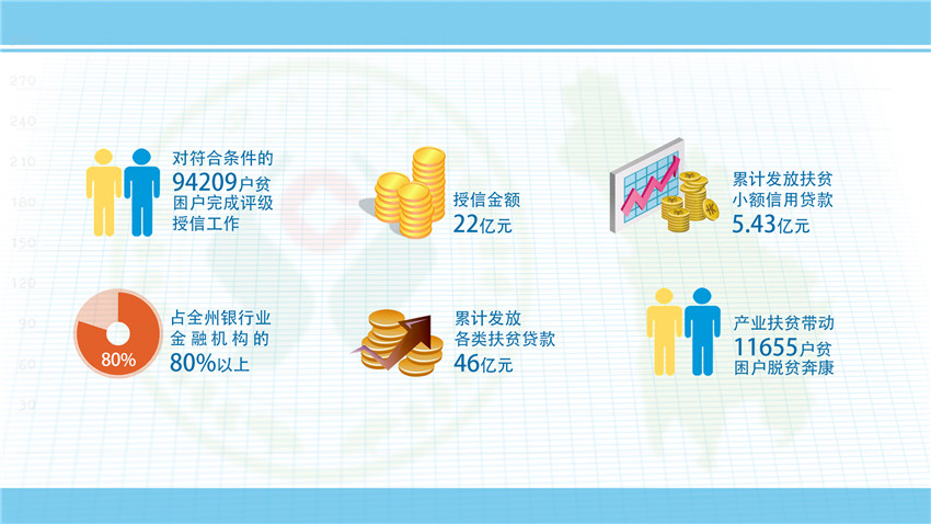 ——強(qiáng)化信貸扶持。緊緊圍繞全州脫貧退出總體目標(biāo),打破各縣劃分片區(qū)、劃分任務(wù)的局面,使脫貧攻堅(jiān)工作從行政手段調(diào)整到市場(chǎng)競(jìng)爭(zhēng)和民生工程兼顧,堅(jiān)持“三個(gè)一百”——即百分百對(duì)符合條件的建檔立卡貧困戶進(jìn)行評(píng)級(jí)授信,授信面達(dá)到100%;百分百滿足貧困戶有效信貸需求;百分百滿足產(chǎn)業(yè)帶動(dòng)扶貧項(xiàng)目有效信貸需求,加強(qiáng)與18個(gè)縣黨委政府的溝通對(duì)接,瞄準(zhǔn)每個(gè)縣的地方特產(chǎn)產(chǎn)業(yè),因地制宜,為每個(gè)縣量身打造“一縣一策”的金融服務(wù)方案,累計(jì)發(fā)放各類產(chǎn)業(yè)、項(xiàng)目帶動(dòng)扶貧貸款20.69億元。