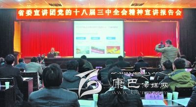 12月25日,省委宣講團在海螺溝景區(qū)宣講黨的十八屆三中全會精神,由省委講師團教授韓旭作宣講,海螺溝景區(qū)景區(qū)管理局、磨西鎮(zhèn)、新興鄉(xiāng)副科實職以上干部,21個行政村村兩委班子成員,部份州、縣人大政協(xié)代表,離退休同志代表和三老干部代表,省州屬各派駐機構(gòu)負(fù)責(zé)人以及部分旅游企業(yè)負(fù)責(zé)人聆聽了報告。圖為報告會現(xiàn)場。(李娟 攝影報道)