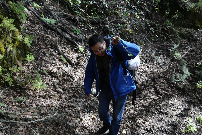 前方報(bào)道組組員余秋林穿行在樹(shù)林中。