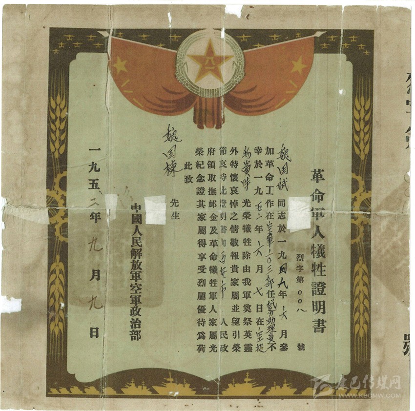 魏國(guó)賓革命犧牲軍人家屬光榮紀(jì)念證。
