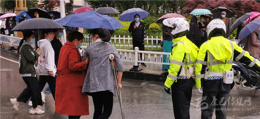 這邊剛幫助考生尋回遺失的準(zhǔn)考證,那邊一名杵著拐杖的考生引起了執(zhí)勤交警的注意,這時(shí)這名考生在家長(zhǎng)的攙扶下正準(zhǔn)備過(guò)馬路,交警見(jiàn)狀,立即上前為其疏導(dǎo)交通,開辟出綠色通道。記者了解到,這名考生叫段尚玲,兩周前意外摔傷了腿,這給她的應(yīng)試之路帶來(lái)了不少麻煩,幸好在交警的幫助下,她安全順利地進(jìn)入了考場(chǎng)。