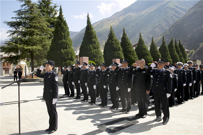 州政府副州長、州公安局長李強率參與民警向紅軍飛奪瀘定橋紀念碑敬獻花籃,莊嚴鞠躬,表達沉痛哀思。在紅色圣地,民警們還面對鮮紅黨旗,舉起右拳,重溫入黨誓詞,向革命烈士致以最崇高的敬意。