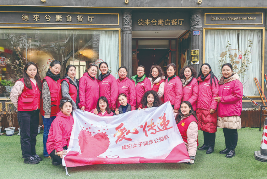 她所在的康定女子徒步公益隊,是近些年“溜溜情歌城”小有名氣的志愿服務(wù)社會組織,由州市各行各業(yè)熱衷徒步、熱心公益的女性自發(fā)組成;自2013年3月成立至今,隊伍已壯大至70人。“起初,只是利用周末、節(jié)假日同姐妹們散步徒步鍛煉身體,沿途順手清理垃圾,做些力所能及、有益他人的小事?!标犻L周慧蓉介紹,隊伍初創(chuàng)時不足20人。
