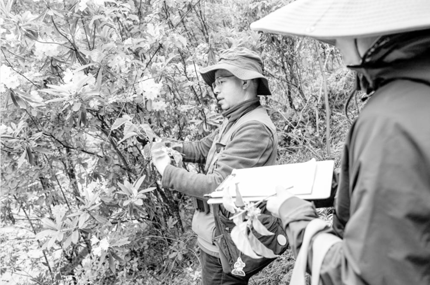 回到山腳,張遠(yuǎn)彬正在打開植物“盲盒”?!斑@里海拔差別大,杜鵑的種類特別多,這是以前沒有記錄到的?!睆堖h(yuǎn)彬直呼“驚喜”,邊用手機(jī)拍下形態(tài),邊口述特征讓一旁的助手記錄。