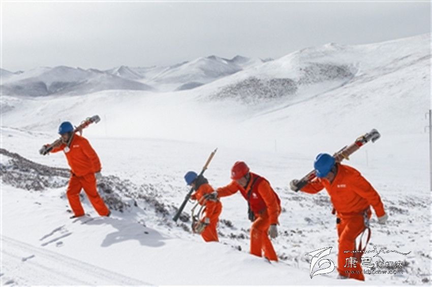石渠電力員工行走在海拔4200米的風(fēng)雪巡線路上。