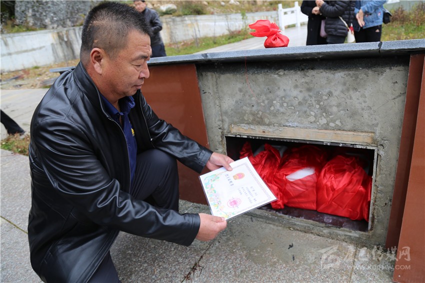 程新林把烈士證復(fù)印件放入墓中。
