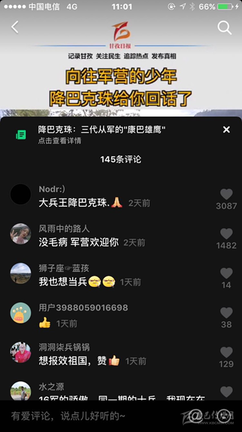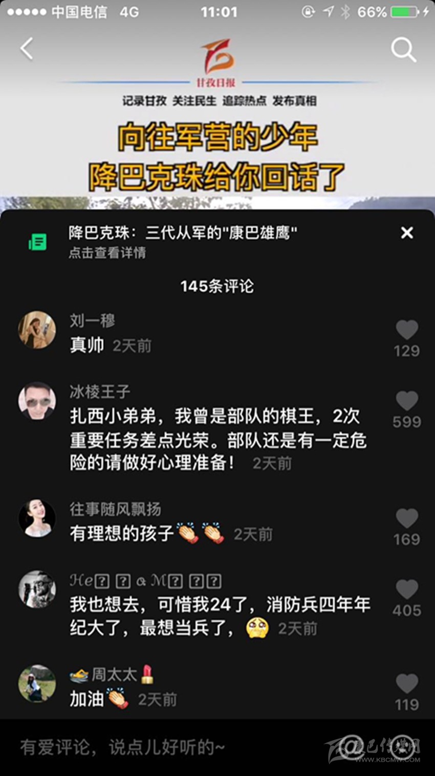 三段視頻,六百多條留言,近兩千萬次播放,一個藏族少年的軍旅夢在網(wǎng)絡(luò)上熱烈綻放,而農(nóng)牧區(qū)許多青年的軍旅夢也就此被點燃,忠勇大愛的“血脈”在康巴高原傳承! (本網(wǎng)記者 肖宵 整理)