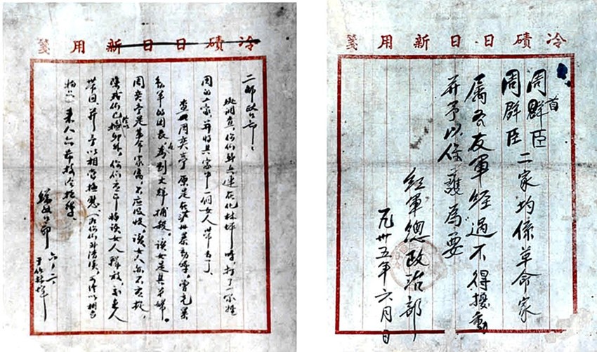 1935年6月2日,劉伯承同志寫給2師政治部的信。周奕庭是劉伯承順、瀘起義部隊(duì)的團(tuán)長,起義失敗后轉(zhuǎn)入地下,1932年在成都被捕后遇害。紅2師先頭部隊(duì)抵達(dá)化林坪時(shí)錯(cuò)將其家屬當(dāng)作 “土豪”,抓走其弟媳。劉伯承同志為此給2師政治部寫信,說明其家為革命烈屬。其弟媳很快得到釋放,其家屬也得到了保護(hù)。