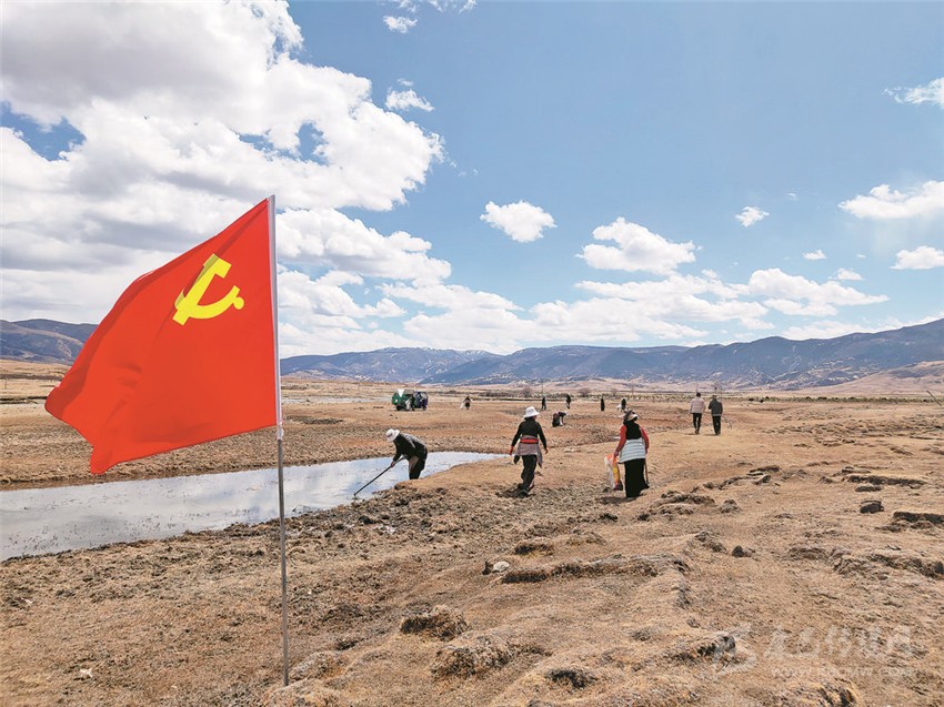 圖為該村黨員和村民正在撿拾草場(chǎng)里的垃圾。