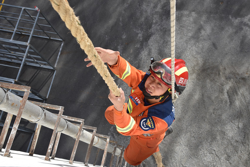 危急時刻,姜鵬和隊友迅速開展救援行動。姜鵬在做好個人防護(hù)后,立即將救生繩索拴在腰上,從10余米高處一躍而下,利用繩索迅速下降,快速地將被困女子固定住,成功將女子救出。