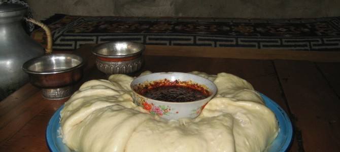 巴塘“銀絲”長面,面粉中加蛋清,手工搟出的面條又細又長,制作精細,臊子湯精工配制,吃法考究,以小碗翻到大碗內再吃。