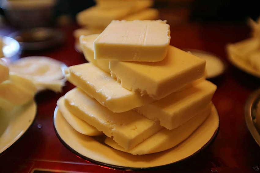 酥油是藏族民眾主要的食用油脂。藏族諺語(yǔ)說(shuō):“沒(méi)有駿馬的草原不美,沒(méi)有酥油的糌粑不香?!辈刈迕癖姶蛩钟筒琛⑷圄佤味茧x不開(kāi)酥油。據(jù)史料記載,文成公主入藏時(shí),帶去了內(nèi)地的茶葉,公主“使乳變成奶酪,從乳取酥油”,有了茶和酥油,才有了酥油茶。